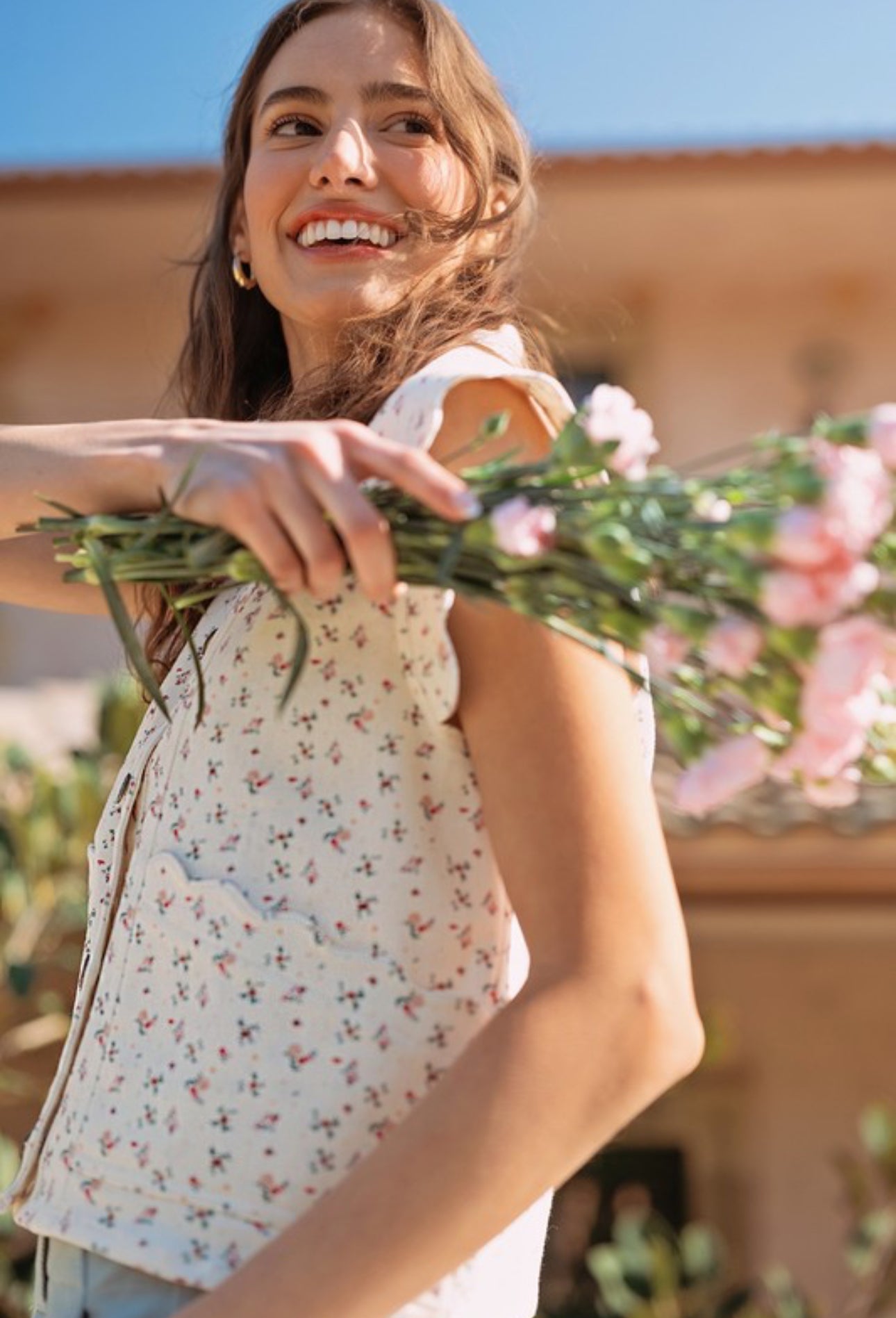This 100% cotton denim vest brings soft, sunny charm to any outfit. With delicate florals, scalloped pockets and flutter sleeves, it's perfect lightweight layer for warm days and breezy moments.